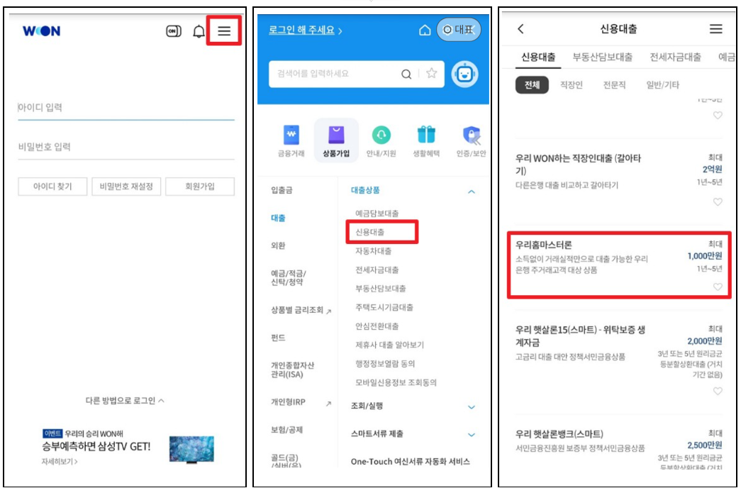 위비뱅크 어플 실행 > 메뉴 > 대출 > 신용대출 > 우리홈마스터론 >대출신청