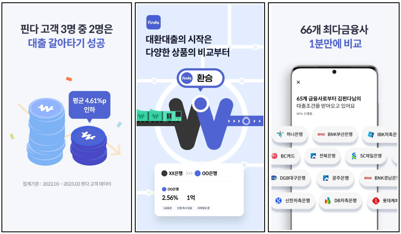 핀다(finda) 모바일 어플은 70개 이상의 금융 회사와 은행에 방문하여 서류제출 하여야 하는 번거로움 없이, 공인인증서(공동인증서)로 1분만에 간편하게 대출비교 조회가 가능한 어플입니다. 또한 대출비교 조회 서비스 뿐만 아니라 대출관리, 맟춤형 추천(카드,P2P투자 등), 금융뉴스 무료 구독 등 다양한 서비스를 이용하실 수 있으니 아래 참고바랍니다.