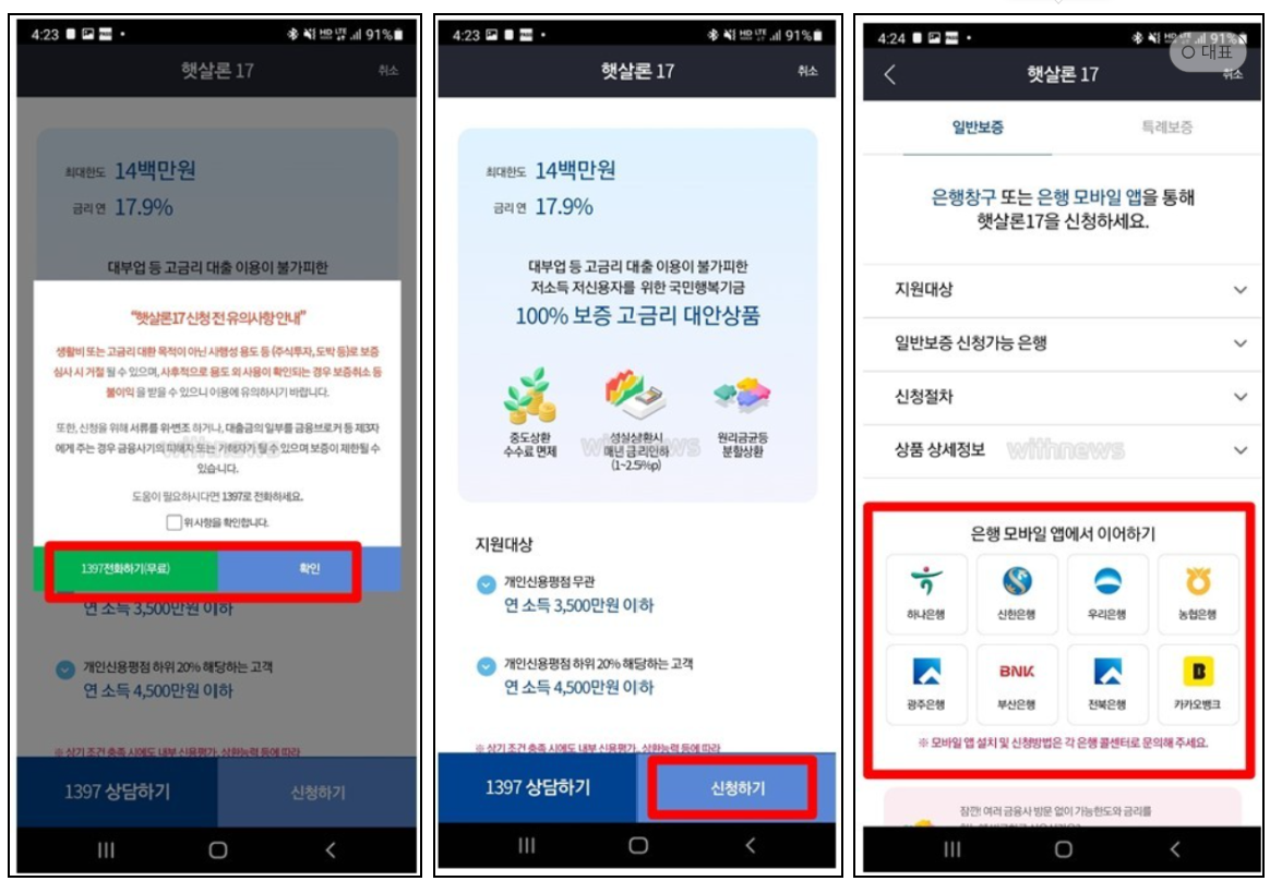 🔎유의사항확인 > 신청하기 > 은행어플 실행 > 주거래 은행 선택 후 햇살론15 신청하기