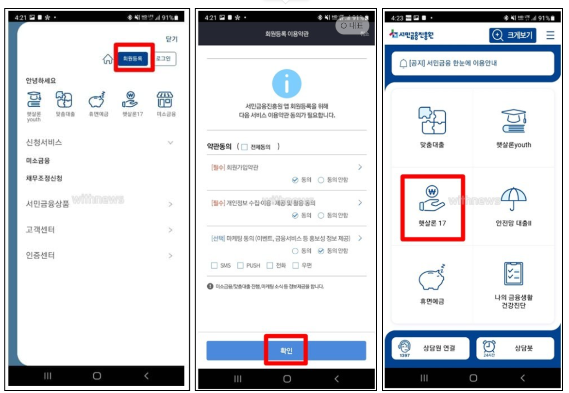 🔎서민금융진흥원 회원등록 > 회원등록 이요약관 > 햇살론15 선택